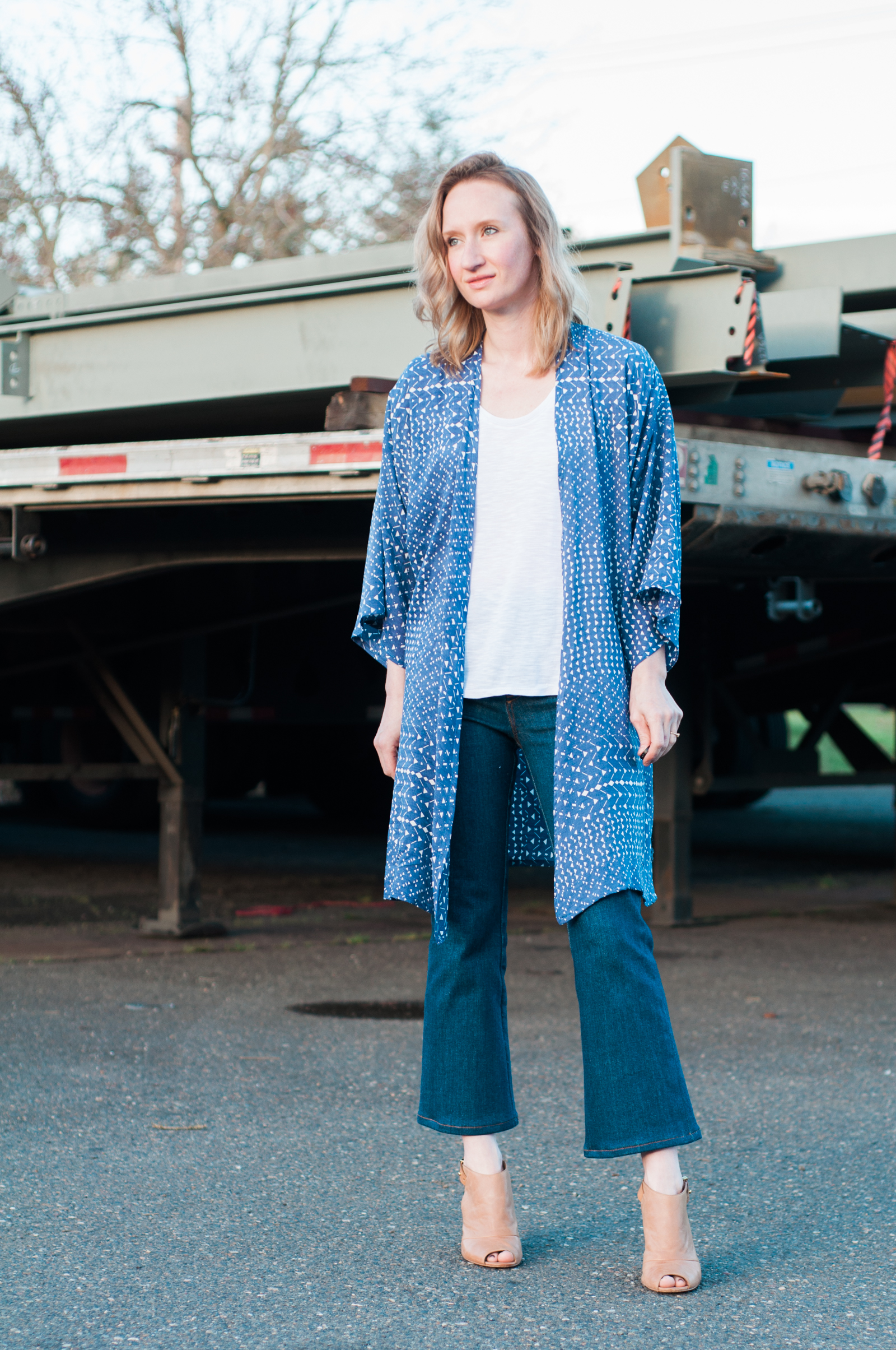 I made the Florence Kimono in one night including printing and assembling the pattern. I know! Even with the French seams and bias binding around the front edge, it was a breeze to make and super satisfying, too. The fabric is a super lightweight and flowy rayon challis I purchased in LA a couple years ago. I'm so glad I bought three yards of it, because it was PERFECT for this kimono. I wasn't sure if it was really going to be my style, but I am in love with this whole look. I made the XS-S size. (Measurements: 5'6" tall, 34-28-36-ish. It changes every day. Babies, I tell you. But basically I am a RTW 4 with a little muffin top added for good measure.)