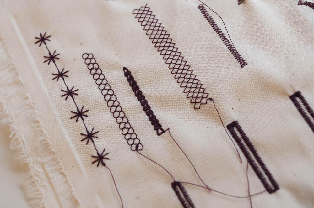 As for the stitch quality, well...just take a look above. It is impeccable! I created these samples using a doubled piece of muslin with no stabilizer, and already, the stitches look fabulous. Buttonholes are also a breeze on this machine (no more holding your breath!). You just pick which buttonhole you want to sew with the handy touchscreen, pop a button into your buttonhole foot and go. Just watch! (No hands, really!)