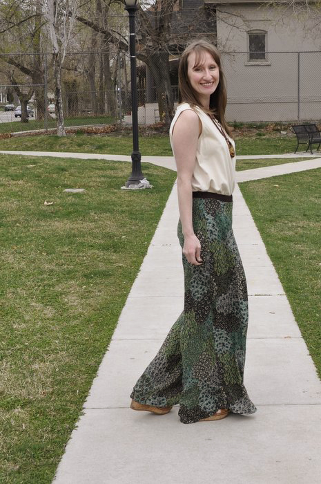 Here’s the problem: I’m just really not feeling this outfit. I read on a blog somewhere that you should either go “tight or tucked” when selecting a top to go with palazzo pants…so, I found this shirt at the thrift store and thought it would be perfect tucked. It’s probably early 90s, raw silk…from the Limited (remember when raw silk was ALL the rage?). It’s super comfortable and pretty long, too. But I just don’t think it works. I think it would look better with leggings or a short skirt with a belt (untucked, perhaps).