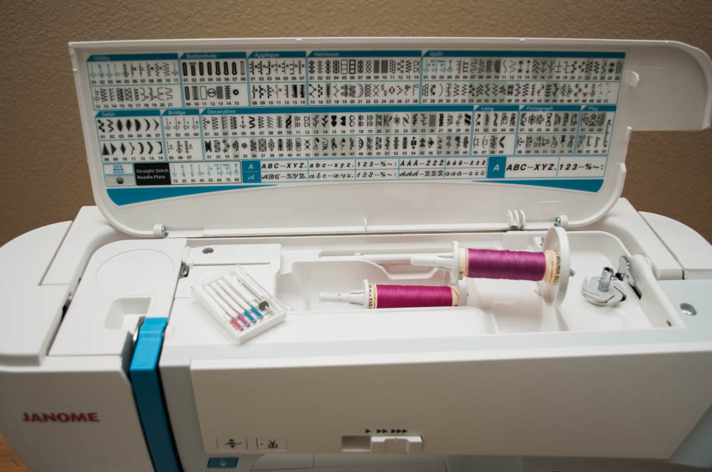 One thing I love about all the Janome machines I've used is the on-machine storage. The Skyline S7 doesn't have as much as my MC8900, but it does have this handy area on the front of the machine. You can store several of your most-used feet, some bobbins, the buttonhole foot and walking foot and several other small items for quick access.