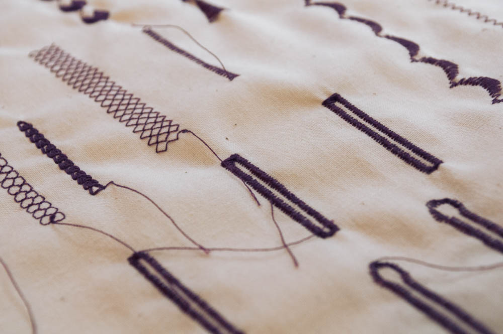 As for the stitch quality, well...just take a look above. It is impeccable! I created these samples using a doubled piece of muslin with no stabilizer, and already, the stitches look fabulous. Buttonholes are also a breeze on this machine (no more holding your breath!). You just pick which buttonhole you want to sew with the handy touchscreen, pop a button into your buttonhole foot and go. Just watch! (No hands, really!)