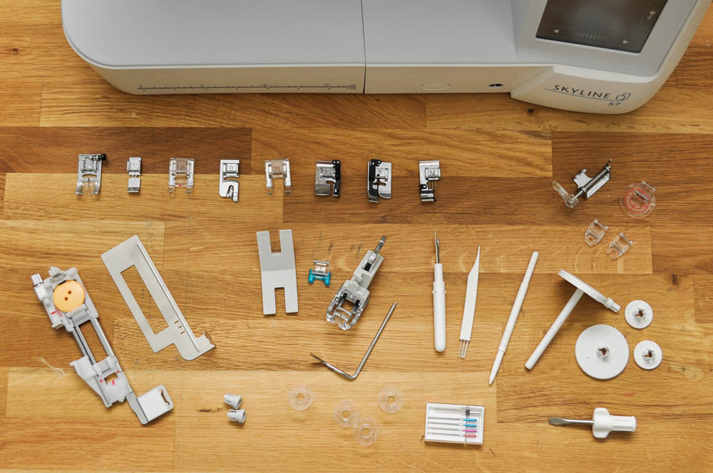 One thing I love about all the Janome machines I've used is the on-machine storage. The Skyline S7 doesn't have as much as my MC8900, but it does have this handy area on the front of the machine. You can store several of your most-used feet, some bobbins, the buttonhole foot and walking foot and several other small items for quick access.